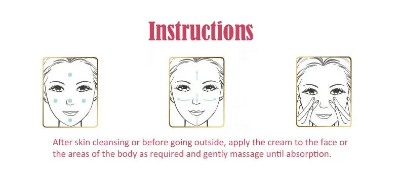 After skin cleansing or before going outside ,apply the cream to the face or the areas of the body as required and gently massage until absorption.